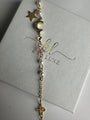 Embrace the elegance of the cosmos with our Cosmic Rose Bracelet. This delicate gold-toned chain features luminous pearls, a dreamy rose quartz bead, and celestial charms each adorned with fine crystal accents.