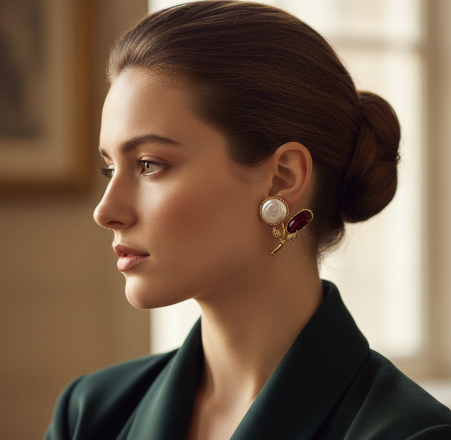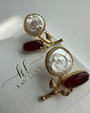 Elevate your elegance with our Garnet Earrings, a stunning blend of timeless charm and modern artistry. These earrings feature lustrous baroque pearls paired with rich deep red glass stones, delicately framed in textured gold-plated floral settings. Designed to resemble a blooming branch, the earrings embody femininity, sophistication, and natural beauty.