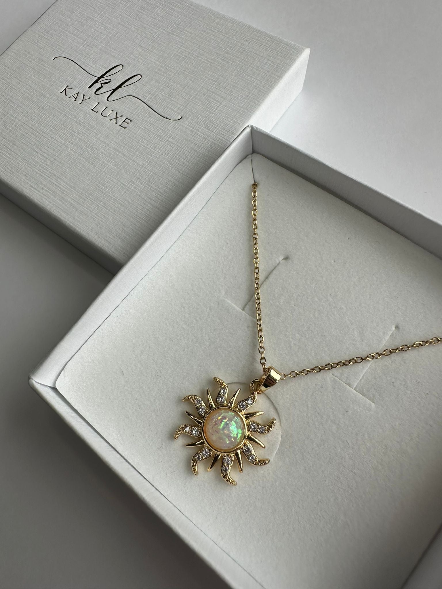 Radiate timeless elegance with our Lumen Ray Necklace, featuring an opal stone centre surrounded by delicate, sparkling rays. The soft shimmer of the central stone beautifully contrasts with the high-polish gold finish, creating a piece that feels both celestial and sophisticated. Effortlessly versatile, this necklace is perfect for adding a touch of warmth and charm to both everyday outfits and evening looks.