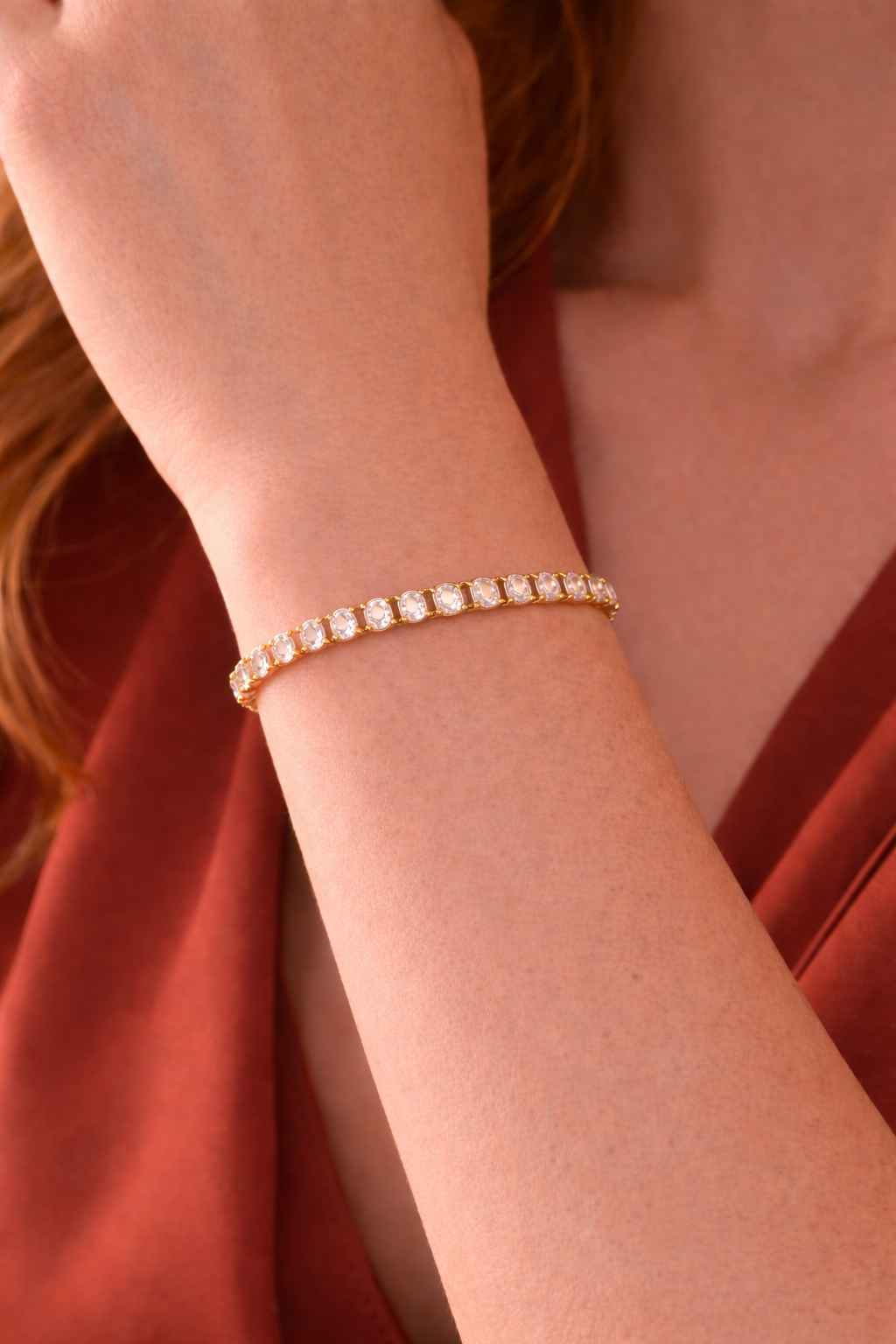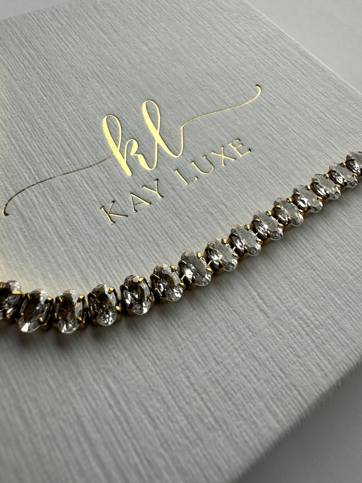 Timeless elegance meets modern durability in our Opaline Glow Tennis Bracelet designed with precision-set brilliant-cut crystals; this bracelet delivers a continuous line of radiant sparkle that elevates both everyday looks and evening wear. Waterproof & hypoallergenic perfect for layering or for a refined statement.